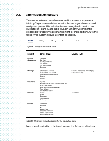 Digital Brand Identity Manual82A.1. Information ArchitectureTo optimize information architecture and improve user experience, Ministry/Department websites must implement a global menu-based navigation system. This includes five mandatory level-1 sections, as illustrated in Figure 45 and Table 11. Each Ministry/Department is responsible for identifying relevant content for these sections, with the flexibility to customize level-2 content as needed.Figure 45: Navigation menu sectionsLevel 1 Level 2 (L2) Level 3 (L3)Ministry About us/Department Our Team Our OrganizationsOur Groups Our PerformanceDirectoryOfferings Schemes and Services Schemes and Services detailed page Competitions and Awards Competitions page International CollaborationsCareers Tenders Documents Reports Acts and Policies (to include Guidelines too)Orders and Notices Publications (to include eBooks)Press ReleaseGazette NotificationsResources Photos Album page VideosBrochures PresentationsPodcasts Connect Contact UsDirectory RTI Visitor%u2019s PassGrievance RedressalCitizen EngagementParliament Questions Table 11: Illustrative content grouping for the navigation menuMenu-based navigation is designed to meet the following objectives: