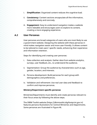 Digital Brand Identity Manual83i. Simplification: Organized content reduces the cognitive load.ii. Consistency: Content sections encapsulate all the information, comprehensively and concisely.iii. Engagement: Easy-to-understand navigation makes a website more relatable and encourages users to explore its content, creating a more engaging experience.A.2 User PersonasUser personas are broad categories of users who are most likely to use a government website. Designing the website with these personas in mind makes navigation easier and more user-friendly. It allows content to be tailored to meet users' specific needs, enhancing their experience and information retention.Steps for identifying and creating user personas:i. Data collection and analysis: Gather data from website analytics, surveys, user feedback, etc., to understand the audience.ii. Segmentation: Group the audience by characteristics such as age, gender, location, and interests.iii. Persona development: Build personas for each group with demographics and preferences.iv. Validation and refinement: Use real user data and feedback to confirm and improve personas.Ministry/Department specific personasMinistries/Departments must identify and create personas relevant to their focus areas by following the above steps.The DBIM Toolkit website (https://dbimtoolkit.digifootprint.gov.in) features persona illustrations for Central Ministries and Departments. Some personas are illustrated in Figure 46.