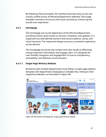 Digital Brand Identity Manual86By following these principles, the interface becomes easy to use and visually unified across all Ministry/Department websites. Each page template maintains structural and visual consistency, enhancing the overall user experience.A.4.1. HomepageThe homepage acts as the digital face of the Ministry/Department, providing citizens quick access to services, initiatives, and updates. It is organized into well-defined sections that ensure balance, clarity, and visual harmony. The responsive design ensures a consistent experience across devices. The homepage prioritizes key content and uses visuals to effectively convey important information and engage users. It is designed for user-friendly navigation and engagement to ensure transparency, accessibility, and effective communication.A.4.1.1. Single-Page Ministry WebsiteMinistries with multiple departments must follow a single-page website template with departments displayed as clickable tiles, linking to their respective websites, as illustrated in Figure 48.Figure 48: Illustrative homepage for single page Ministry website