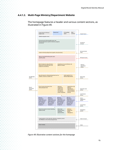 Digital Brand Identity Manual87A.4.1.2. Multi-Page Ministry/Department WebsiteThe homepage features a header and various content sections, as illustrated in Figure 49. Figure 49: Illustrative content sections for the homepage