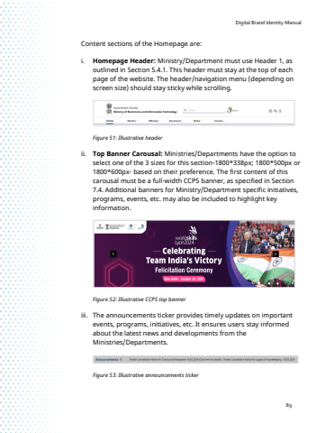 Digital Brand Identity Manual89Content sections of the Homepage are:i. Homepage Header: Ministry/Department must use Header 1, as outlined in Section 5.4.1. This header must stay at the top of each page of the website. The header/navigation menu (depending on screen size) should stay sticky while scrolling.Figure 51: Illustrative headerii. Top Banner Carousal: Ministries/Departments have the option to select one of the 3 sizes for this section-1800*338px; 1800*500px or 1800*600px- based on their preference. The first content of this carousal must be a full-width CCPS banner, as specified in Section 7.4. Additional banners for Ministry/Department specific initiatives, programs, events, etc. may also be included to highlight key information.Figure 52: Illustrative CCPS top banneriii. The announcements ticker provides timely updates on important events, programs, initiatives, etc. It ensures users stay informed about the latest news and developments from the Ministries/Departments.Figure 53: Illustrative announcements ticker