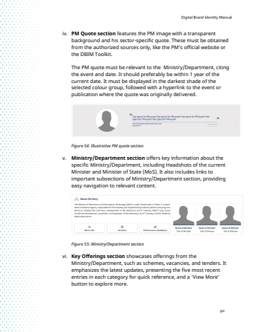 Digital Brand Identity Manual90iv. PM Quote section features the PM image with a transparent background and his sector-specific quote. These must be obtained from the authorized sources only, like the PM%u2019s official website or the DBIM Toolkit. The PM quote must be relevant to the Ministry/Department, citing the event and date. It should preferably be within 1 year of the current date. It must be displayed in the darkest shade of the selected colour group, followed with a hyperlink to the event or publication where the quote was originally delivered. Figure 54: Illustrative PM quote sectionv. Ministry/Department section offers key information about the specific Ministry/Department, including Headshots of the current Minister and Minister of State (MoS). It also includes links to important subsections of Ministry/Department section, providing easy navigation to relevant content. Figure 55: Ministry/Department sectionvi. Key Offerings section showcases offerings from the Ministry/Department, such as schemes, vacancies, and tenders. It emphasizes the latest updates, presenting the five most recent entries in each category for quick reference, and a %u2018View More%u2019 button to explore more.