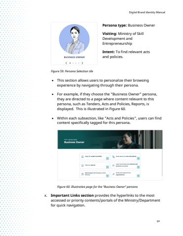 Digital Brand Identity Manual92Figure 59: Persona Selection tile%u2022 This section allows users to personalize their browsing experience by navigating through their persona. %u2022 For example, if they choose the \they are directed to a page where content relevant to this persona, such as Tenders, Acts and Policies, Reports, is displayed. This is illustrated in Figure 60.%u2022 Within each subsection, like \content specifically tagged for this persona.Figure 60: Illustrative page for the %u201cBusiness Owner%u201d personax. Important Links section provides the hyperlinks to the most accessed or priority contents/portals of the Ministry/Department for quick navigation.Persona type: Business OwnerVisiting: Ministry of Skill Development and EntrepreneurshipIntent: To find relevant acts and policies.