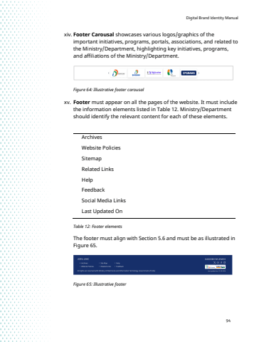 Digital Brand Identity Manual94xiv. Footer Carousal showcases various logos/graphics of the important initiatives, programs, portals, associations, and related to the Ministry/Department, highlighting key initiatives, programs,and affiliations of the Ministry/Department.Figure 64: Illustrative footer carousalxv. Footer must appear on all the pages of the website. It must include the information elements listed in Table 12. Ministry/Department should identify the relevant content for each of these elements.Archives Website Policies Sitemap Related Links HelpFeedbackSocial Media Links Last Updated On Table 12: Footer elements The footer must align with Section 5.6 and must be as illustrated in Figure 65.Figure 65: Illustrative footer