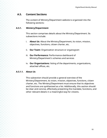 Digital Brand Identity Manual95A.5. Content Sections The content of Ministry/Department website is organized into the following sections:A.5.1. Ministry/Department This section comprises details about the Ministry/Department. Its subsections include: i. About Us: About the Ministry/Department, its vision, mission, objectives, functions, citizen charter, etc.ii. Our Team: Organization structure or organogramiii. Our Performance: Performance dashboard of Ministry/Department%u2019s schemes and services iv. Our Organizations: listing of the departments, organizations, attached offices, etc.A.5.1.1. About UsThis subsection should provide a general overview of theMinistry/Department, its vision, mission, objectives, functions, citizen charter, etc. The Ministry/Department must ensure that its objectives and functions are synthesized as a list. Additionally, this section should be clear and concise, effectively presenting the mandate, functions, and other relevant details in a meaningful way for citizens.