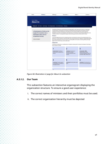 Digital Brand Identity Manual96Figure 66: Illustrative L2 page for About Us subsectionA.5.1.2. Our Team This subsection features an interactive organogram displaying the organization structure. To ensure a good user experience:i. The correct names of ministers and their portfolios must be used.ii. The correct organization hierarchy must be depicted