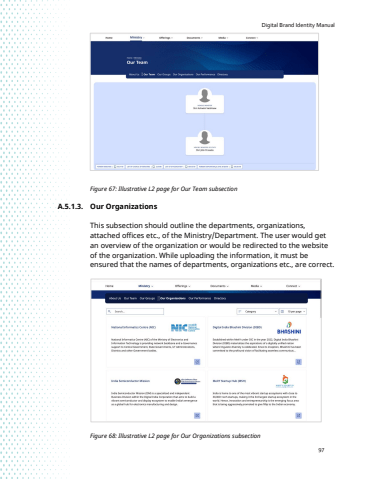 Digital Brand Identity Manual97Figure 67: Illustrative L2 page for Our Team subsectionA.5.1.3. Our OrganizationsThis subsection should outline the departments, organizations, attached offices etc., of the Ministry/Department. The user would get an overview of the organization or would be redirected to the website of the organization. While uploading the information, it must be ensured that the names of departments, organizations etc., are correct.Figure 68: Illustrative L2 page for Our Organizations subsection