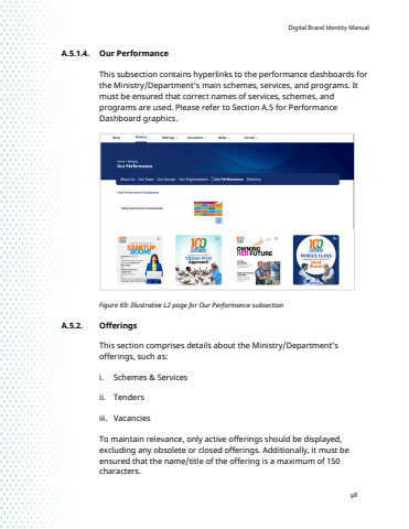 Digital Brand Identity Manual98A.5.1.4. Our PerformanceThis subsection contains hyperlinks to the performance dashboards for the Ministry/Department%u2019s main schemes, services, and programs. It must be ensured that correct names of services, schemes, and programs are used. Please refer to Section A.5 for Performance Dashboard graphics.Figure 69: Illustrative L2 page for Our Performance subsectionA.5.2. OfferingsThis section comprises details about the Ministry/Department%u2019s offerings, such as:i. Schemes & Servicesii. Tendersiii. VacanciesTo maintain relevance, only active offerings should be displayed,excluding any obsolete or closed offerings. Additionally, it must be ensured that the name/title of the offering is a maximum of 150 characters.
