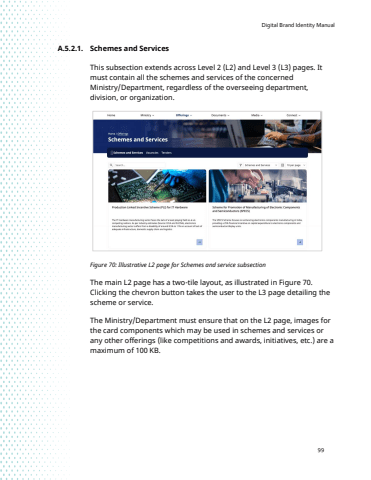 Digital Brand Identity Manual99A.5.2.1. Schemes and Services This subsection extends across Level 2 (L2) and Level 3 (L3) pages. It must contain all the schemes and services of the concerned Ministry/Department, regardless of the overseeing department, division, or organization.Figure 70: Illustrative L2 page for Schemes and service subsectionThe main L2 page has a two-tile layout, as illustrated in Figure 70. Clicking the chevron button takes the user to the L3 page detailing the scheme or service.The Ministry/Department must ensure that on the L2 page, images for the card components which may be used in schemes and services or any other offerings (like competitions and awards, initiatives, etc.) are a maximum of 100 KB.