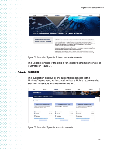 Digital Brand Identity Manual100Figure 71: Illustrative L3 page for Schemes and service subsectionThe L3 page consists of the details for a specific scheme or service, as illustrated in Figure 71. A.5.2.2. Vacancies This subsection displays all the current job openings in the Ministry/Department, as illustrated in Figure 72. It is recommended that PDF size should be a maximum of 5 MB.Figure 72: Illustrative L2 page for Vacancies subsection