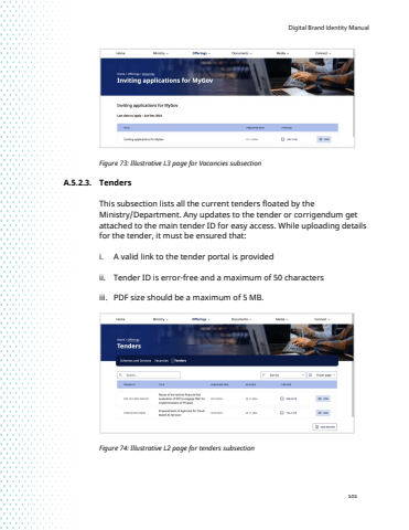 Digital Brand Identity Manual101Figure 73: Illustrative L3 page for Vacancies subsectionA.5.2.3. TendersThis subsection lists all the current tenders floated by the Ministry/Department. Any updates to the tender or corrigendum get attached to the main tender ID for easy access. While uploading details for the tender, it must be ensured that: i. A valid link to the tender portal is providedii. Tender ID is error-free and a maximum of 50 characters iii. PDF size should be a maximum of 5 MB.Figure 74: Illustrative L2 page for tenders subsection