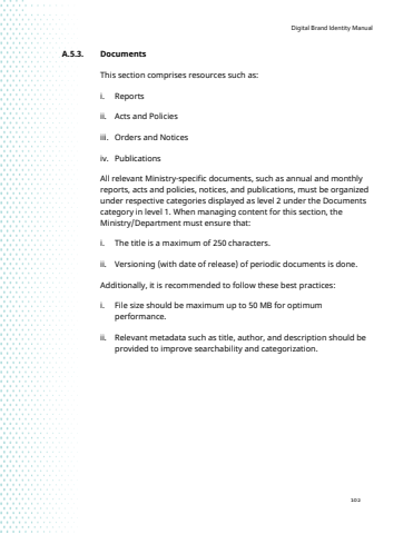 Digital Brand Identity Manual102A.5.3. DocumentsThis section comprises resources such as:i. Reports ii. Acts and Policies iii. Orders and Notices iv. Publications All relevant Ministry-specific documents, such as annual and monthly reports, acts and policies, notices, and publications, must be organized under respective categories displayed as level 2 under the Documents category in level 1. When managing content for this section, the Ministry/Department must ensure that:i. The title is a maximum of 250 characters.ii. Versioning (with date of release) of periodic documents is done.Additionally, it is recommended to follow these best practices:i. File size should be maximum up to 50 MB for optimum performance.ii. Relevant metadata such as title, author, and description should be provided to improve searchability and categorization.