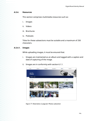 Digital Brand Identity Manual104A.5.4. ResourcesThis section comprises multimedia resources such as: i. Imagesii. Videosiii. Brochuresiv. PodcastsTitles for these subsections must be suitable and a maximum of 250 characters.A.5.4.1. Images While uploading images, it must be ensured that:i. Images are maintained as an album and tagged with a caption and date of capturing of the image.ii. Images are in conformity with section 6.1.1.Figure 77: Illustrative L2 page for Photos subsection