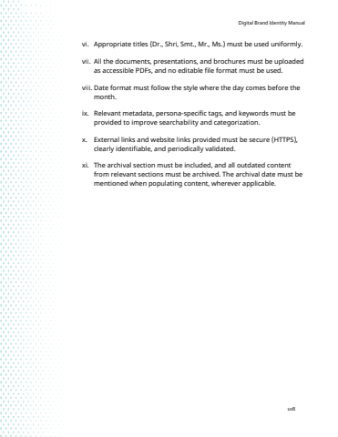 Digital Brand Identity Manual108vi. Appropriate titles (Dr., Shri, Smt., Mr., Ms.) must be used uniformly.vii. All the documents, presentations, and brochures must be uploaded as accessible PDFs, and no editable file format must be used.viii. Date format must follow the style where the day comes before the month.ix. Relevant metadata, persona-specific tags, and keywords must be provided to improve searchability and categorization.x. External links and website links provided must be secure (HTTPS), clearly identifiable, and periodically validated.xi. The archival section must be included, and all outdated content from relevant sections must be archived. The archival date must be mentioned when populating content, wherever applicable.