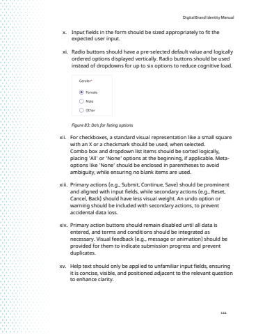 Digital Brand Identity Manual111x. Input fields in the form should be sized appropriately to fit the expected user input.xi. Radio buttons should have a pre-selected default value and logically ordered options displayed vertically. Radio buttons should be used instead of dropdowns for up to six options to reduce cognitive load.Figure 83: Do%u2019s for listing options xii. For checkboxes, a standard visual representation like a small square with an X or a checkmark should be used, when selected.Combo box and dropdown list items should be sorted logically, placing 'All' or 'None' options at the beginning, if applicable. Metaoptions like 'None%u2018 should be enclosed in parentheses to avoid ambiguity, while ensuring no blank items are used.xiii. Primary actions (e.g., Submit, Continue, Save) should be prominent and aligned with input fields, while secondary actions (e.g., Reset, Cancel, Back) should have less visual weight. An undo option or warning should be included with secondary actions, to prevent accidental data loss. xiv. Primary action buttons should remain disabled until all data is entered, and terms and conditions should be integrated as necessary. Visual feedback (e.g., message or animation) should be provided for them to indicate submission progress and prevent duplicates.xv. Help text should only be applied to unfamiliar input fields, ensuring it is concise, visible, and positioned adjacent to the relevant question to enhance clarity.