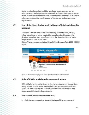 Digital Brand Identity Manual114Social media channels should be used as a strategic medium by prioritizing an audience-centric approach and reaching out to a larger mass. It is crucial to contextualize content across channels to maintain relevance to the vision and mission of the concerned government organization. C.1 Use of the State Emblem of India on official social media accountThe State Emblem should be added to any content (video, image, infographic) that is being created for social media. However, the detailed guideline may be referred to in the State Emblem of India (Regulation of Use) Rules 2007 (https://www.mha.gov.in/sites/default/files/EmblemRules2007_12022019.pdf).Figure 84: Illustrative example for the usage of the State Emblem on Social MediaC.2. Role of CIO in social media communicationsCIOs will play an important role in the harmonisation of the content being posted on the social media platforms by using a data-driven approach and aligning the content calendar with the mission and objectives of Ministries/Departments.C.2.1. Role of Chief Information Officer (CIO)i. Actively communicating about initiatives of the government