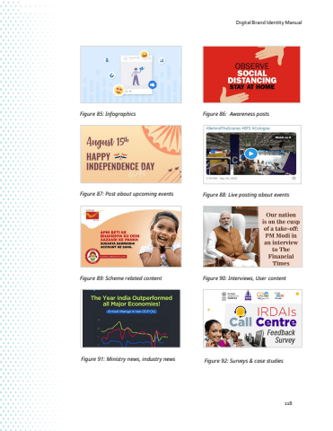 Digital Brand Identity Manual118Figure 85: Infographics Figure 86: Awareness postsFigure 87: Post about upcoming events Figure 88: Live posting about eventsFigure 89: Scheme related content Figure 90: Interviews, User contentFigure 91: Ministry news, industry news Figure 92: Surveys & case studies
