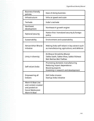 Digital Brand Identity Manual120Business-friendly policies Ease of doing businessInfrastructure Infra at speed and scaleTechade India's techadeNortheast development Northeast-A growth engineNational security Nation first- homeland security & foreign policySustainability Environment and sustainabilityAtmanirbhar Bharat initiativeMaking India self-reliant in key sectors such as manufacturing, agriculture, and defenceUnity in diversityEk Bharat Shreshtha BharatSabka Saath, Sabka Vikas, Sabka VishwasBeti Bachao Beti PadhaoSelf-reliant IndiaPromoting domestic manufacturingReducing import dependenceBoosting exportsInvesting in research and developmentEmpowering all IndiansSkill India missionStartup India initiativeMann Ki Baat Live and content created and posted on Social Media post Mann Ki Baat