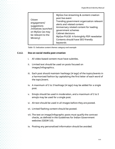 Digital Brand Identity Manual121Citizen engagement/ suggestions /initiatives launched on MyGov (as may be relevant to the Ministry)MyGov live streaming & content creation post live eventTrending government organization relevant alerts and related contentAnniversary related content for leading government schemesCabinet decisionsMyGov PULSE- A fortnightly PDF newsletterContents should have SEO friendly keywordsTable 13: Indicative content themes category and exampleC.4.2. Dos on social media post creationi. All video-based content must have subtitles.ii. Limited text should be used on posts focused on images/infographics.iii. Each post should maintain hashtags (# tags) of the topics/events in a harmonized fashion by capitalizing the first letter of each word of the topic/event.iv. A maximum of 2 to 3 hashtags (# tags) may be added for a single post.v. Emojis should be used in moderation, and a maximum of 2 to 3 emojis may be used for a single post.vi. Alt text should be used in all images before they are posted.vii. Limited flashing content should be posted.viii. The text on image/infographic posts must qualify the contrast checks, as defined in the Guidelines for Indian Government websites (GIGW 3.0).ix. Posting any personalized information should be avoided.