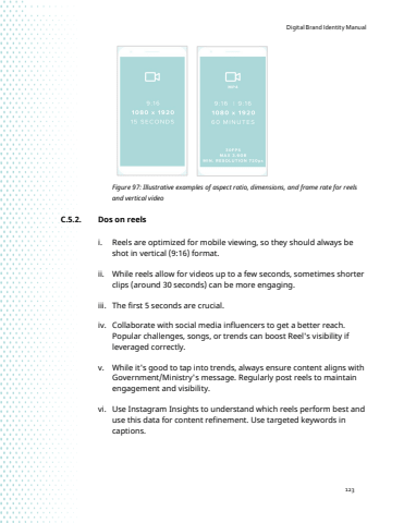 Digital Brand Identity Manual123Figure 97: Illustrative examples of aspect ratio, dimensions, and frame rate for reels and vertical videoC.5.2. Dos on reelsi. Reels are optimized for mobile viewing, so they should always be shot in vertical (9:16) format.ii. While reels allow for videos up to a few seconds, sometimes shorter clips (around 30 seconds) can be more engaging.iii. The first 5 seconds are crucial.iv. Collaborate with social media influencers to get a better reach. Popular challenges, songs, or trends can boost Reel's visibility if leveraged correctly.v. While it's good to tap into trends, always ensure content aligns with Government/Ministry's message. Regularly post reels to maintain engagement and visibility.vi. Use Instagram Insights to understand which reels perform best and use this data for content refinement. Use targeted keywords in captions.