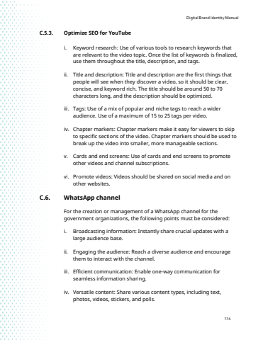 Digital Brand Identity Manual124C.5.3. Optimize SEO for YouTubei. Keyword research: Use of various tools to research keywords that are relevant to the video topic. Once the list of keywords is finalized, use them throughout the title, description, and tags.ii. Title and description: Title and description are the first things that people will see when they discover a video, so it should be clear, concise, and keyword rich. The title should be around 50 to 70 characters long, and the description should be optimized.iii. Tags: Use of a mix of popular and niche tags to reach a wider audience. Use of a maximum of 15 to 25 tags per video.iv. Chapter markers: Chapter markers make it easy for viewers to skip to specific sections of the video. Chapter markers should be used to break up the video into smaller, more manageable sections.v. Cards and end screens: Use of cards and end screens to promote other videos and channel subscriptions.vi. Promote videos: Videos should be shared on social media and on other websites.C.6. WhatsApp channelFor the creation or management of a WhatsApp channel for the government organizations, the following points must be considered:i. Broadcasting information: Instantly share crucial updates with a large audience base.ii. Engaging the audience: Reach a diverse audience and encourage them to interact with the channel.iii. Efficient communication: Enable one-way communication for seamless information sharing.iv. Versatile content: Share various content types, including text, photos, videos, stickers, and polls.