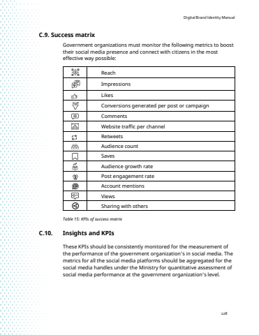 Digital Brand Identity Manual128C.9. Success matrixGovernment organizations must monitor the following metrics to boost their social media presence and connect with citizens in the most effective way possible:ReachImpressionsLikesConversions generated per post or campaignCommentsWebsite traffic per channelRetweetsAudience countSaves Audience growth ratePost engagement rateAccount mentionsViewsSharing with othersTable 15: KPIs of success matrixC.10. Insights and KPIsThese KPIs should be consistently monitored for the measurement of the performance of the government organization%u2019s in social media. The metrics for all the social media platforms should be aggregated for the social media handles under the Ministry for quantitative assessment of social media performance at the government organization%u2019s level.