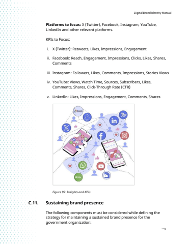 Digital Brand Identity Manual129Platforms to focus: X (Twitter), Facebook, Instagram, YouTube, LinkedIn and other relevant platforms.KPIs to Focus:i. X (Twitter): Retweets, Likes, Impressions, Engagement ii. Facebook: Reach, Engagement, Impressions, Clicks, Likes, Shares, Commentsiii. Instagram: Followers, Likes, Comments, Impressions, Stories Views iv. YouTube: Views, Watch Time, Sources, Subscribers, Likes, Comments, Shares, Click-Through Rate (CTR)v. LinkedIn: Likes, Impressions, Engagement, Comments, SharesFigure 99: Insights and KPIsC.11. Sustaining brand presence The following components must be considered while defining the strategy for maintaining a sustained brand presence for the government organization: