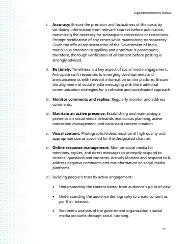 Digital Brand Identity Manual130i. Accuracy: Ensure the precision and factualness of the posts by validating information from relevant sources before publication, minimizing the necessity for subsequent corrections or retractions. Prompt rectification of any errors while maintaining transparency. Given the official representation of the Government of India, meticulous attention to spelling and grammar is paramount; therefore, thorough verification of all content before posting is strongly advised.ii. Be timely: Timeliness is a key aspect of social media engagement. Anticipate swift responses to emerging developments and announcements with relevant information on the platform. Ensure the alignment of social media messaging with the traditional communication strategies for a cohesive and coordinated approach.iii. Monitor comments and replies: Regularly monitor and address comments.iv. Maintain an active presence: Establishing and maintaining a presence on social media demands meticulous planning, active interaction management, and consistent content creation.v. Visual content: Photographs/videos must be of high quality and appropriate size as specified for the designated channel.vi. Online response management: Monitor social media for mentions, replies, and direct messages to promptly respond to citizens' questions and concerns. Actively Monitor and respond to & address negative comments and misinformation on social media platforms.vii. Building people%u2019s trust by active engagement:%u2022 Understanding the content better from audience%u2019s point of view %u2022 Understanding the audience demography to create content as per their interest.%u2022 Sentiment analysis of the government organization%u2019s social media accounts through social listening.