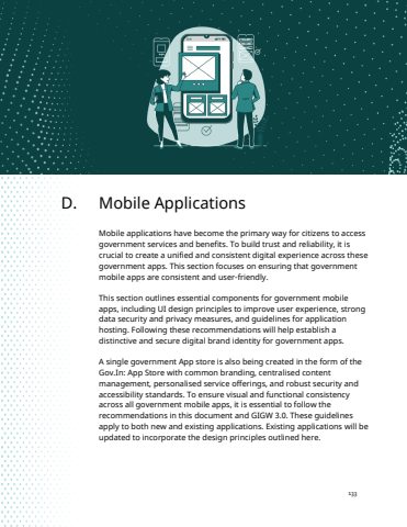 Digital Brand Identity Manual133D. Mobile Applications Mobile applications have become the primary way for citizens to access government services and benefits. To build trust and reliability, it is crucial to create a unified and consistent digital experience across these government apps. This section focuses on ensuring that government mobile apps are consistent and user-friendly.This section outlines essential components for government mobile apps, including UI design principles to improve user experience, strong data security and privacy measures, and guidelines for application hosting. Following these recommendations will help establish a distinctive and secure digital brand identity for government apps.A single government App store is also being created in the form of the Gov.In: App Store with common branding, centralised content management, personalised service offerings, and robust security and accessibility standards. To ensure visual and functional consistency across all government mobile apps, it is essential to follow the recommendations in this document and GIGW 3.0. These guidelines apply to both new and existing applications. Existing applications will be updated to incorporate the design principles outlined here.