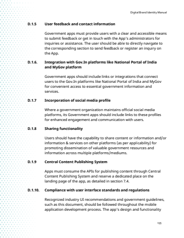 Digital Brand Identity Manual135D.1.5 User feedback and contact informationGovernment apps must provide users with a clear and accessible means to submit feedback or get in touch with the App's administrators for inquiries or assistance. The user should be able to directly navigate to the corresponding section to send feedback or register an inquiry on the App.D.1.6. Integration with Gov.In platforms like National Portal of India and MyGov platformGovernment apps should include links or integrations that connect users to the Gov.In platforms like National Portal of India and MyGov for convenient access to essential government information and services.D.1.7 Incorporation of social media profileWhere a government organization maintains official social media platforms, its Government apps should include links to these profiles for enhanced engagement and communication with users.D.1.8 Sharing functionalityUsers should have the capability to share content or information and/or information & services on other platforms (as per applicability) for promoting dissemination of valuable government resources and information across multiple platforms/mediums. D.1.9 Central Content Publishing SystemApps must consume the APIs for publishing content through Central Content Publishing System and reserve a dedicated place on the landing page of the app, as detailed in section 7.4.D.1.10. Compliance with user interface standards and regulationsRecognized industry UI recommendations and government guidelines, such as this document, should be followed throughout the mobile application development process. The app's design and functionality