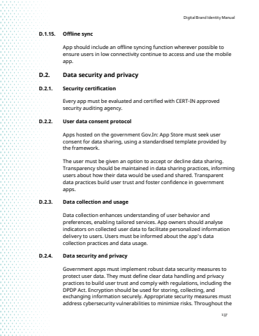 Digital Brand Identity Manual137D.1.15. Offline syncApp should include an offline syncing function wherever possible to ensure users in low connectivity continue to access and use the mobile app.D.2. Data security and privacyD.2.1. Security certificationEvery app must be evaluated and certified with CERT-IN approved security auditing agency.D.2.2. User data consent protocolApps hosted on the government Gov.In: App Store must seek user consent for data sharing, using a standardised template provided by the framework.The user must be given an option to accept or decline data sharing. Transparency should be maintained in data sharing practices, informing users about how their data would be used and shared. Transparent data practices build user trust and foster confidence in government apps.D.2.3. Data collection and usageData collection enhances understanding of user behavior and preferences, enabling tailored services. App owners should analyse indicators on collected user data to facilitate personalized information delivery to users. Users must be informed about the app's data collection practices and data usage.D.2.4. Data security and privacyGovernment apps must implement robust data security measures to protect user data. They must define clear data handling and privacy practices to build user trust and comply with regulations, including the DPDP Act. Encryption should be used for storing, collecting, and exchanging information securely. Appropriate security measures must address cybersecurity vulnerabilities to minimize risks. Throughout the
