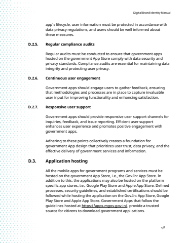 Digital Brand Identity Manual138app's lifecycle, user information must be protected in accordance with data privacy regulations, and users should be well informed about these measures.D.2.5. Regular compliance auditsRegular audits must be conducted to ensure that government apps hosted on the government App Store comply with data security and privacy standards. Compliance audits are essential for maintaining data integrity and protecting user privacy.D.2.6. Continuous user engagementGovernment apps should engage users to gather feedback, ensuring that methodologies and processes are in place to capture invaluable user input for improving functionality and enhancing satisfaction.D.2.7. Responsive user supportGovernment apps should provide responsive user support channels for inquiries, feedback, and issue reporting. Efficient user support enhances user experience and promotes positive engagement with government apps.Adhering to these points collectively creates a foundation for government App design that prioritizes user trust, data privacy, and the effective delivery of government services and information.D.3. Application hostingAll the mobile apps for government programs and services must be hosted on the government App Store, i.e., the Gov.In: App Store. In addition to this, the applications may also be hosted on the platform specific app stores, i.e., Google Play Store and Apple App Store. Defined processes, security guidelines, and established certifications should be followed while hosting the application on the Gov.In: App Store, Google Play Store and Apple App Store. Government Apps that follow the guidelines hosted at https://apps.mgov.gov.in/, provide a trusted source for citizens to download government applications.