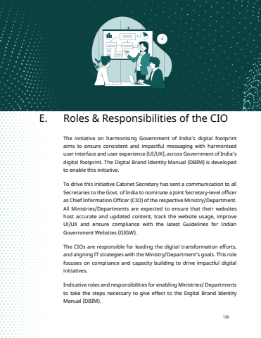 Digital Brand Identity Manual139E. Roles & Responsibilities of the CIOThe initiative on harmonising Government of India%u2019s digital footprintaims to ensure consistent and impactful messaging with harmonised user interface and user experience (UI/UX), across Government of India%u2019s digital footprint. The Digital Brand Identity Manual (DBIM) is developed to enable this initiative.To drive this initiative Cabinet Secretary has sent a communication to all Secretaries to the Govt. of India to nominate a Joint Secretary-level officer as Chief Information Officer (CIO) of the respective Ministry/Department. All Ministries/Departments are expected to ensure that their websites host accurate and updated content, track the website usage, improve Ul/UX and ensure compliance with the latest Guidelines for Indian Government Websites (GIGW).The CIOs are responsible for leading the digital transformation efforts, and aligning IT strategies with the Ministry/Department%u2019s goals. This role focuses on compliance and capacity building to drive impactful digital initiatives.Indicative roles and responsibilities for enabling Ministries/ Departments to take the steps necessary to give effect to the Digital Brand Identity Manual (DBIM).