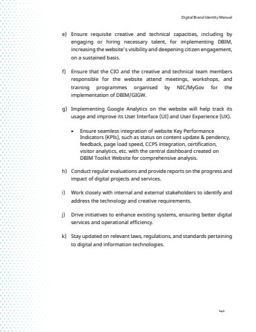 Digital Brand Identity Manual141e) Ensure requisite creative and technical capacities, including by engaging or hiring necessary talent, for implementing DBIM, increasing the website's visibility and deepening citizen engagement, on a sustained basis.f) Ensure that the CIO and the creative and technical team members responsible for the website attend meetings, workshops, andtraining programmes organised by NIC/MyGov for theimplementation of DBIM/GIGW.g) Implementing Google Analytics on the website will help track its usage and improve its User Interface (UI) and User Experience (UX). %u2022 Ensure seamless integration of website Key Performance Indicators (KPIs), such as status on content update & pendency, feedback, page load speed, CCPS integration, certification, visitor analytics, etc. with the central dashboard created on DBIM Toolkit Website for comprehensive analysis.h) Conduct regular evaluations and provide reports on the progress and impact of digital projects and services.i) Work closely with internal and external stakeholders to identify and address the technology and creative requirements.j) Drive initiatives to enhance existing systems, ensuring better digital services and operational efficiency.k) Stay updated on relevant laws, regulations, and standards pertaining to digital and information technologies.