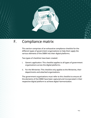 Digital Brand Identity Manual143F. Compliance matrixThis section comprises of an exhaustive compliance checklist for the different types of government organizations to help them apply the various elements of the DBIM into their digital platforms. Two types of checklists have been created: i. Generic application: This checklist applies to all types of government organizations across the digital platforms.ii. For the Ministries: This checklist only applies to the Ministries, their departments and attached organizations. The government organizations must refer to this checklist to ensure all the elements of the DBIM have been captured and incorporated in their respective digital platform to achieve digital harmonization.