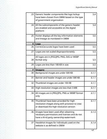 Digital Brand Identity Manual14623 Generic header components like logo lockup have been chosen from DBIM based on the type of government organization5.424 All the subcomponents of the generic header are enabled and accessible on the digital platform5.425 Footer displays all the key information elements and lineage as mandated in DBIM5.6E Logo26 Correct/accurate logos have been used 5.527 Logos are not scaled disproportionately 5.528All logos are in JPEG/JPG, PNG, SVG or WEBP format only 5.529 Logos are less than 100 KB in size 5.5F Imagery30 Background images are under 500 KB 6.1.131 Banner and header images are under 500 KB 6.1.132 Thumbnail images are under 100 KB 6.1.133 High resolution images are less than 5 MB 6.1.134 All images are in JPEG/JPG, PNG or WEBP format only6.1.135 Thumbnail have been provided for high resolution images along with provision to view or download the high resolution version6.1.136 Images have been used after obtaining necessary permissions and licenses and do not have a third party ownership watermark6.1.337 Headshot images for individuals used on the website is as defined in DBIM6.1.4