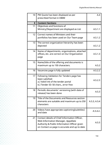 Digital Brand Identity Manual14910 PM Quote has been displayed as per prescribed format in DBIMA.4E Content Sections11 Objectives and functions of Ministry/Department are displayed as List A.5.1.112 Correct names of Ministers and their portfolios has been used on Our Team page A.5.1.213 The correct organization hierarchy has been depicted A.5.1.214 Name of departments, organizations, attached offices, etc. are correct on Our Organization pageA.5.1.315 Name/title of the offering and documents is maximum up to 150 characters. A.5.216 Vacancies page is fully updated A.5.2.217 Following Validation for Tenders page has been satisfied: a.) Valid link of the tender portalb.) Tender ID: 50 chars., error free A.5.2.318 Periodic documents%u2019 versioning (with date of release) has been done A.5.319 Title of the Documents and Resources section elements are suitable and maximum up to 250 charactersA.5.3, A.5.420 Videos have appropriate captioning(subtitles) and date A.5.4.2.21 Contact details of Chief Information Officer, Web Information Manager, Appellate Authority & Public Information Officer given on Contact us page is accurate and up to dateA.5.5