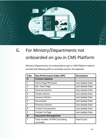 Digital Brand Identity Manual153G. For Ministry/Departments not onboarded on gov.in CMS PlatformMinistry/ Departments not onboarded on gov.in CMS Platform need to provide the following KPIs to centrally monitor the websitesS No. Key Performance Index (KPI) ParametersA Content Updates1 Home Page PM Quote Last Update Date2 Our Team Page Last Update Date3 Schemes Section Last Update Date4 Tender Section Last Update Date5 Vacancy Section Last Update Date6 Documents Last Update Date7 Directory Section Last Update Date8 L2 level Components Last Update Date9 Contact Us Page Last Update DateB Document Management1 Total number of PDFs (including archived)Total Count