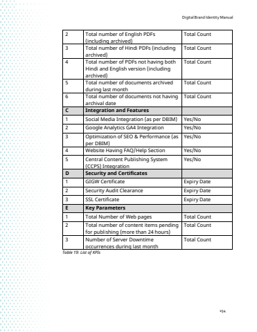 Digital Brand Identity Manual1542 Total number of English PDFs (including archived)Total Count3 Total number of Hindi PDFs (including archived)Total Count4 Total number of PDFs not having both Hindi and English version (including archived)Total Count5 Total number of documents archived during last monthTotal Count6 Total number of documents not having archival date Total CountC Integration and Features1 Social Media Integration (as per DBIM) Yes/No2 Google Analytics GA4 Integration Yes/No3 Optimization of SEO & Performance (as per DBIM)Yes/No4 Website Having FAQ/Help Section Yes/No5 Central Content Publishing System (CCPS) IntegrationYes/NoD Security and Certificates1 GIGW Certificate Expiry Date2 Security Audit Clearance Expiry Date3 SSL Certificate Expiry DateE Key Parameters1 Total Number of Web pages Total Count2 Total number of content items pending for publishing (more than 24 hours)Total Count3 Number of Server Downtime occurrences during last monthTotal CountTable 19: List of KPIs