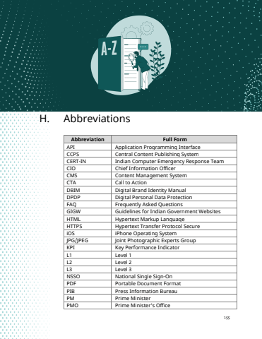 Digital Brand Identity Manual155H. AbbreviationsAbbreviation Full FormAPI Application Programming InterfaceCCPS Central Content Publishing SystemCERT-IN Indian Computer Emergency Response TeamCIO Chief Information OfficerCMS Content Management SystemCTA Call to ActionDBIM Digital Brand Identity ManualDPDP Digital Personal Data ProtectionFAQ Frequently Asked QuestionsGIGW Guidelines for Indian Government WebsitesHTML Hypertext Markup LanguageHTTPS Hypertext Transfer Protocol SecureiOS iPhone Operating SystemJPG/JPEG Joint Photographic Experts GroupKPI Key Performance IndicatorL1 Level 1L2 Level 2L3 Level 3NSSO National Single Sign-OnPDF Portable Document FormatPIB Press Information BureauPM Prime MinisterPMO Prime Minister's Office