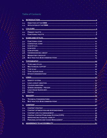 Digital Brand Identity ManualIITable of Contents1. INTRODUCTION .................................................................................................. 11.1. OBJECTIVES OF THE DBIM ..................................................................................... 21.2. APPLICATION OF THE DBIM.................................................................................... 22. COLOURS ........................................................................................................... 52.1. PRIMARY PALETTE................................................................................................ 52.2. FUNCTIONAL PALETTE...........................................................................................63. ICONS AND STYLES........................................................................................... 113.1. FUNCTIONAL ICONS ............................................................................................ 113.2. CONTEXTUAL ICONS ........................................................................................... 113.3. ICON STYLES..................................................................................................... 123.4. ICON SIZES ....................................................................................................... 123.5. ICON OPTIONS................................................................................................... 133.6. CROWDSOURCING LIBRARY .................................................................................. 143.7. MANDATORY CHECKLIST...................................................................................... 143.8. BEST PRACTICES &RECOMMENDATIONS.................................................................. 154. TYPOGRAPHY................................................................................................... 194.1. TYPES AND STYLES............................................................................................. 194.2. MULTILINGUAL SUPPORT ..................................................................................... 204.3. TYPE SCALE ...................................................................................................... 204.4. TYPE COLOUR USAGE .......................................................................................... 234.5. OTHER CONSIDERATIONS .................................................................................... 245. LOGO................................................................................................................ 275.1. IDENTITY SYSTEM............................................................................................... 275.2. LOGO LOCKUP VARIATION .................................................................................... 275.3. COLOUR VARIATIONS .......................................................................................... 305.4. GENERIC BRANDING %u2013HEADER.............................................................................. 315.5. LOGO USAGE GUIDELINES.................................................................................... 335.6. FOOTER ........................................................................................................... 346. IMAGERY .......................................................................................................... 396.1. TECHNICAL CONSIDERATIONS ............................................................................... 396.2. BEST PRACTICES &RECOMMENDATIONS.................................................................. 417. CONTENT ......................................................................................................... 477.1. CONTENT STRATEGY........................................................................................... 477.2. CONTENT OPTIMIZATION AND RESPONSIVENESS ....................................................... 527.3. CONTENT LIFECYCLE MANAGEMENT........................................................................ 537.4. CENTRAL CONTENT PUBLISHING SYSTEM (CCPS) ..................................................... 537.5. IMPROVING MULTILINGUAL VISIBILITY ..................................................................... 567.6. PERSONALIZATION AND COOKIE MANAGEMENT........................................................ 618. ADHERENCE TO ACCESSIBILITY......................................................................... 67