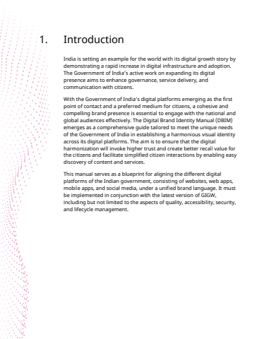1. IntroductionIndia is setting an example for the world with its digital growth story by demonstrating a rapid increase in digital infrastructure and adoption. The Government of India%u2019s active work on expanding its digital presence aims to enhance governance, service delivery, and communication with citizens. With the Government of India%u2019s digital platforms emerging as the first point of contact and a preferred medium for citizens, a cohesive and compelling brand presence is essential to engage with the national and global audiences effectively. The Digital Brand Identity Manual (DBIM) emerges as a comprehensive guide tailored to meet the unique needs of the Government of India in establishing a harmonious visual identity across its digital platforms. The aim is to ensure that the digital harmonization will invoke higher trust and create better recall value for the citizens and facilitate simplified citizen interactions by enabling easy discovery of content and services. This manual serves as a blueprint for aligning the different digital platforms of the Indian government, consisting of websites, web apps, mobile apps, and social media, under a unified brand language. It must be implemented in conjunction with the latest version of GIGW,including but not limited to the aspects of quality, accessibility, security,and lifecycle management.