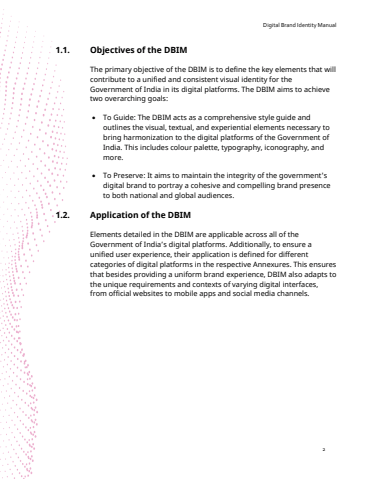 Digital Brand Identity Manual21.1. Objectives of the DBIMThe primary objective of the DBIM is to define the key elements that will contribute to a unified and consistent visual identity for the Government of India in its digital platforms. The DBIM aims to achieve two overarching goals:%u2022 To Guide: The DBIM acts as a comprehensive style guide and outlines the visual, textual, and experiential elements necessary to bring harmonization to the digital platforms of the Government of India. This includes colour palette, typography, iconography, and more.%u2022 To Preserve: It aims to maintain the integrity of the government's digital brand to portray a cohesive and compelling brand presence to both national and global audiences.1.2. Application of the DBIMElements detailed in the DBIM are applicable across all of the Government of India%u2019s digital platforms. Additionally, to ensure a unified user experience, their application is defined for different categories of digital platforms in the respective Annexures. This ensures that besides providing a uniform brand experience, DBIM also adapts to the unique requirements and contexts of varying digital interfaces, from official websites to mobile apps and social media channels.