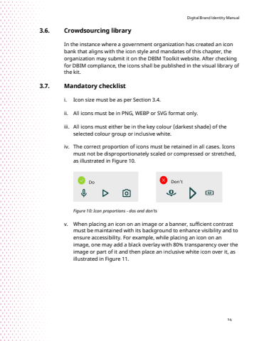 Digital Brand Identity Manual143.6. Crowdsourcing libraryIn the instance where a government organization has created an icon bank that aligns with the icon style and mandates of this chapter, the organization may submit it on the DBIM Toolkit website. After checking for DBIM compliance, the icons shall be published in the visual library of the kit.3.7. Mandatory checklisti. Icon size must be as per Section 3.4.ii. All icons must be in PNG, WEBP or SVG format only.iii. All icons must either be in the key colour (darkest shade) of the selected colour group or inclusive white.iv. The correct proportion of icons must be retained in all cases. Icons must not be disproportionately scaled or compressed or stretched, as illustrated in Figure 10.Figure 10: Icon proportions - dos and don'ts v. When placing an icon on an image or a banner, sufficient contrast must be maintained with its background to enhance visibility and to ensure accessibility. For example, while placing an icon on an image, one may add a black overlay with 80% transparency over the image or part of it and then place an inclusive white icon over it, as illustrated in Figure 11.