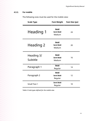 Digital Brand Identity Manual224.3.2. For mobileThe following sizes must be used for the mobile vie Scale Type Font Weight Font Size (px)Heading 1BoldSemi BoldMedium24Heading 2BoldSemi BoldMedium20Heading 3/ SubtitleBoldSemi BoldMedium16Paragraph 1 BoldRegular14Paragraph 2BoldSemi BoldRegular12Small Text 1Semi BoldRegular 10Table 4: Scale types defined for the mobile view