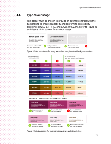Digital Brand Identity Manual234.4. Type colour usageText colour must be chosen to provide an optimal contrast with the background to ensure readability and conform to accessibility guidelines (WCAG 2.1 - 1.4.3. and GIGW 3.0-5.2.14). Refer to Figure 16and Figure 17 for correct font colour usage. Figure 16: Dos and Don'ts for using text colour over functional background coloursFigure 17: Best practices for incorporating primary palette with type