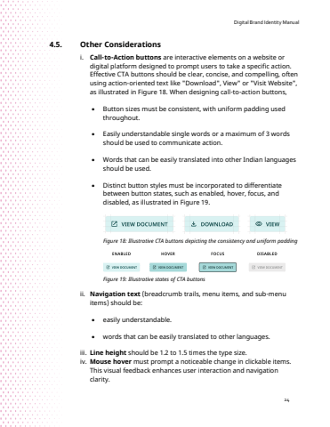 Digital Brand Identity Manual244.5. Other Considerations i. Call-to-Action buttons are interactive elements on a website or digital platform designed to prompt users to take a specific action. Effective CTA buttons should be clear, concise, and compelling, often using action-oriented text like \as illustrated in Figure 18. When designing call-to-action buttons, %u2022 Button sizes must be consistent, with uniform padding used throughout.%u2022 Easily understandable single words or a maximum of 3 words should be used to communicate action. %u2022 Words that can be easily translated into other Indian languages should be used.%u2022 Distinct button styles must be incorporated to differentiate between button states, such as enabled, hover, focus, and disabled, as illustrated in Figure 19.Figure 18: Illustrative CTA buttons depicting the consistency and uniform padding Figure 19: Illustrative states of CTA buttons ii. Navigation text (breadcrumb trails, menu items, and sub-menu items) should be:%u2022 easily understandable.%u2022 words that can be easily translated to other languages.iii. Line height should be 1.2 to 1.5 times the type size.iv. Mouse hover must prompt a noticeable change in clickable items. This visual feedback enhances user interaction and navigation clarity.