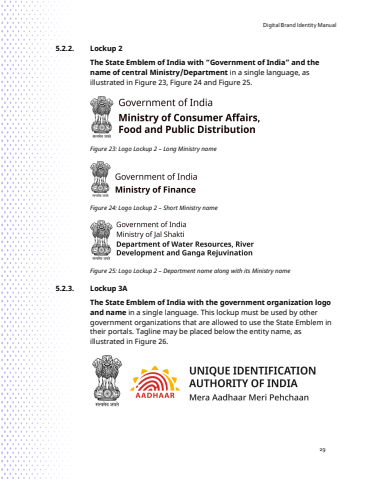 Digital Brand Identity Manual295.2.2. Lockup 2The State Emblem of India with %u201cGovernment of India%u201d and the name of central Ministry/Department in a single language, as illustrated in Figure 23, Figure 24 and Figure 25. Figure 23: Logo Lockup 2 %u2013 Long Ministry nameFigure 24: Logo Lockup 2 %u2013 Short Ministry nameFigure 25: Logo Lockup 2 %u2013 Department name along with its Ministry name 5.2.3. Lockup 3AThe State Emblem of India with the government organization logo and name in a single language. This lockup must be used by other government organizations that are allowed to use the State Emblem in their portals. Tagline may be placed below the entity name, as illustrated in Figure 26.