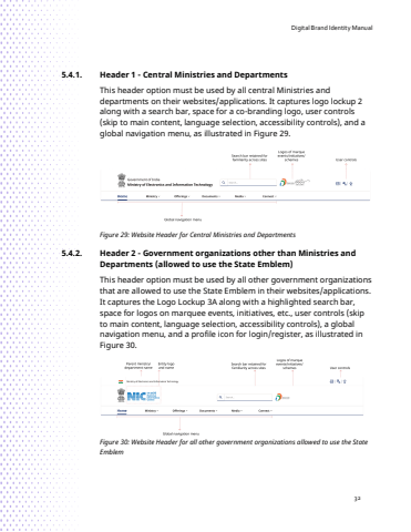 Digital Brand Identity Manual325.4.1. Header 1 - Central Ministries and DepartmentsThis header option must be used by all central Ministries and departments on their websites/applications. It captures logo lockup 2 along with a search bar, space for a co-branding logo, user controls (skip to main content, language selection, accessibility controls), and a global navigation menu, as illustrated in Figure 29.Figure 29: Website Header for Central Ministries and Departments5.4.2. Header 2 - Government organizations other than Ministries and Departments (allowed to use the State Emblem)This header option must be used by all other government organizationsthat are allowed to use the State Emblem in their websites/applications. It captures the Logo Lockup 3A along with a highlighted search bar, space for logos on marquee events, initiatives, etc., user controls (skip to main content, language selection, accessibility controls), a global navigation menu, and a profile icon for login/register, as illustrated in Figure 30.Figure 30: Website Header for all other government organizations allowed to use the State Emblem