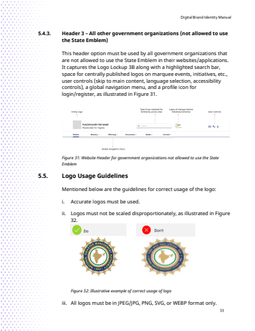 Digital Brand Identity Manual335.4.3. Header 3 %u2013 All other government organizations (not allowed to use the State Emblem)This header option must be used by all government organizations that are not allowed to use the State Emblem in their websites/applications. It captures the Logo Lockup 3B along with a highlighted search bar, space for centrally published logos on marquee events, initiatives, etc., user controls (skip to main content, language selection, accessibility controls), a global navigation menu, and a profile icon for login/register, as illustrated in Figure 31.Figure 31: Website Header for government organizations not allowed to use the State Emblem5.5. Logo Usage GuidelinesMentioned below are the guidelines for correct usage of the logo:i. Accurate logos must be used.ii. Logos must not be scaled disproportionately, as illustrated in Figure 32.Figure 32: Illustrative example of correct usage of logoiii. All logos must be in JPEG/JPG, PNG, SVG, or WEBP format only.